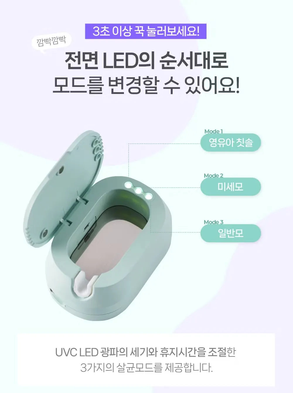제품을 새로 받았거나 배터리가 완전히 방전된 후에는 전원에 연결한 후 최소 1시간은 상단 버튼을 눌러 살균(파란 불빛)을 종료한 상태로 전원을 공급한 후 사용해주세요.