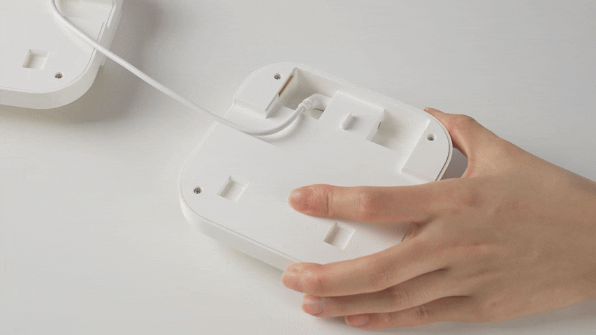 살균기의 뒷면 후크를 크래들에 후크 부분에 결합되도록 맞춰준 후 USB 충전부위를 찾아 아래로 내려 끼워주세요.